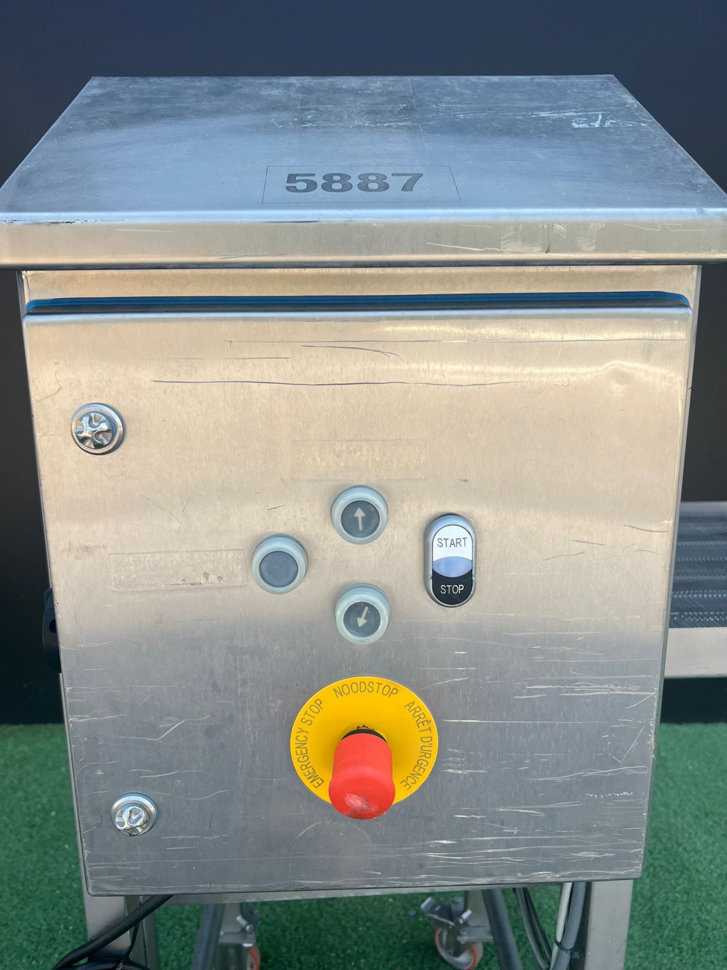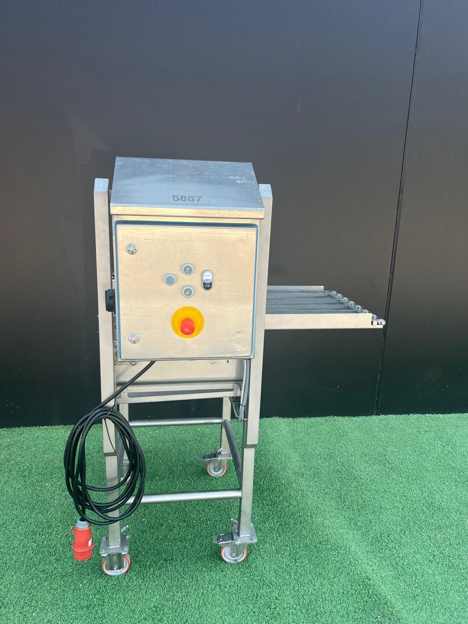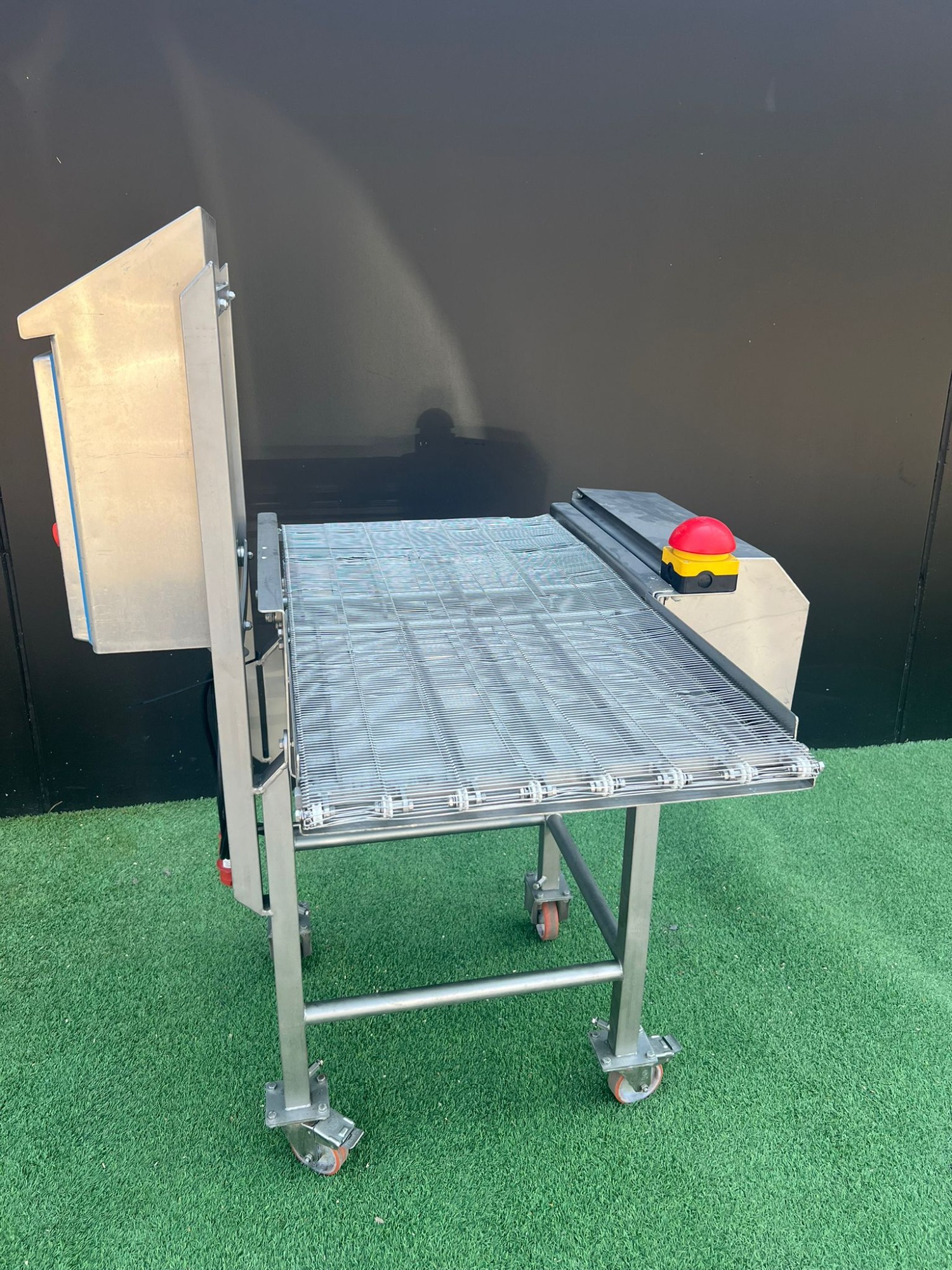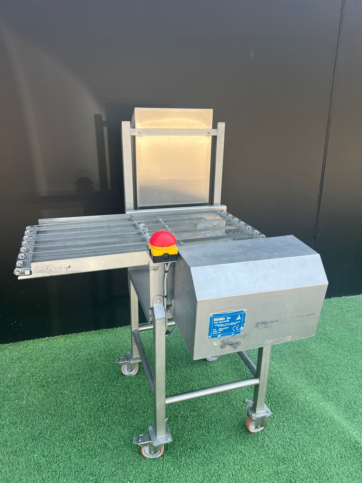 Cinta transportadora de malla móvil Bemei tipo: cinta transportadora de malla 1000 mm x 500 mm número de serie: 30.3964 año de construcción: 2014 cinta transportadora de malla de acero inoxidable ancho de cinta: 500 mm dimensiones totales: 1000 mm x 500 mm x 1600 mm.