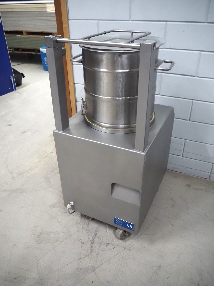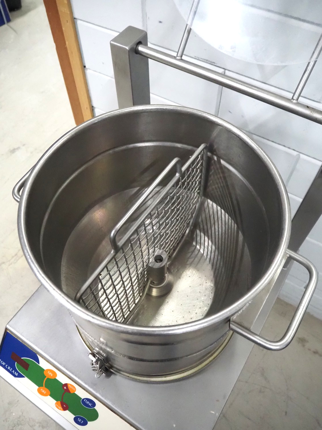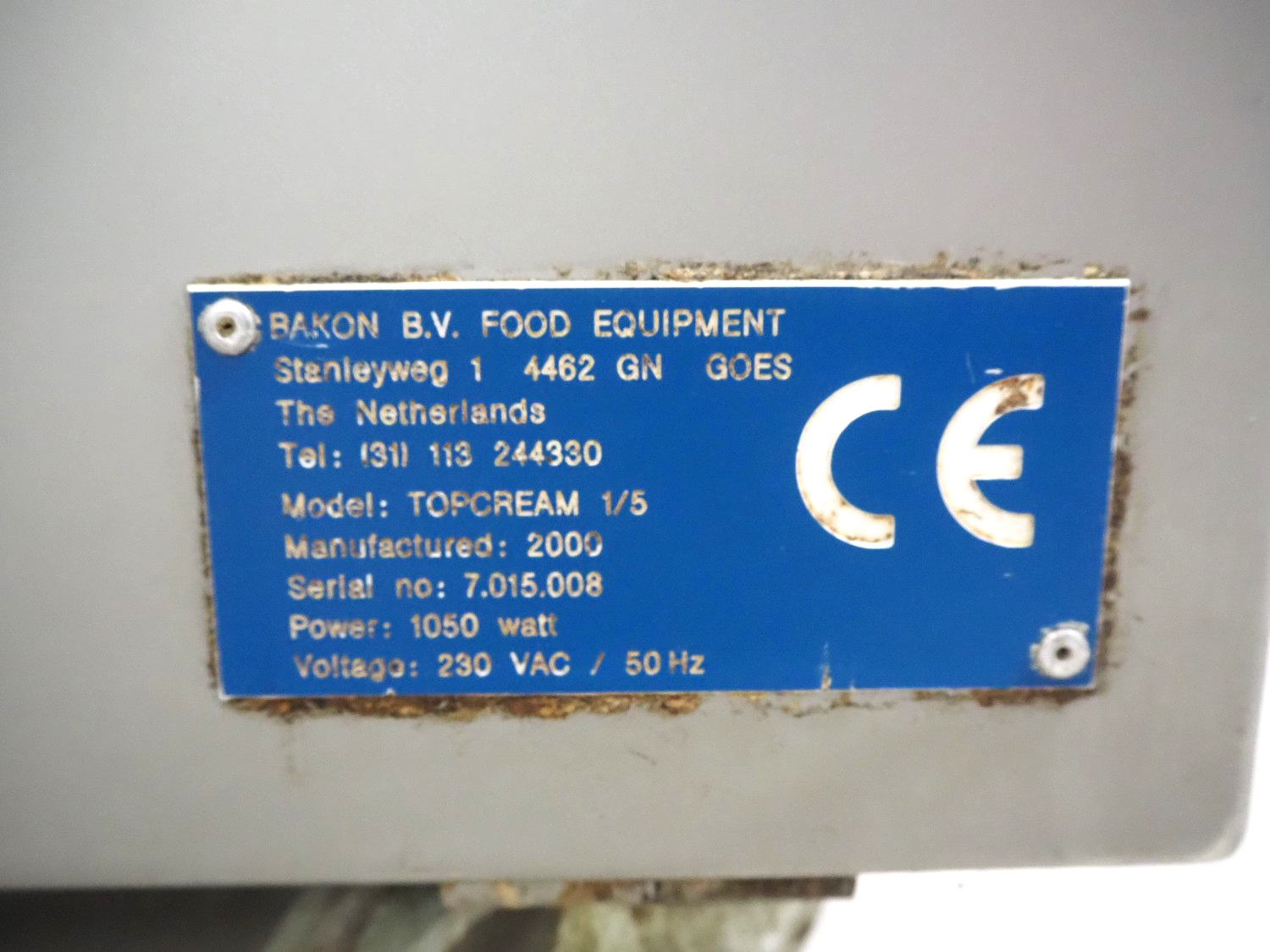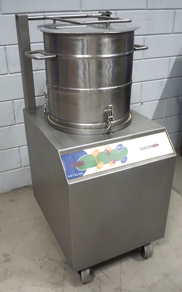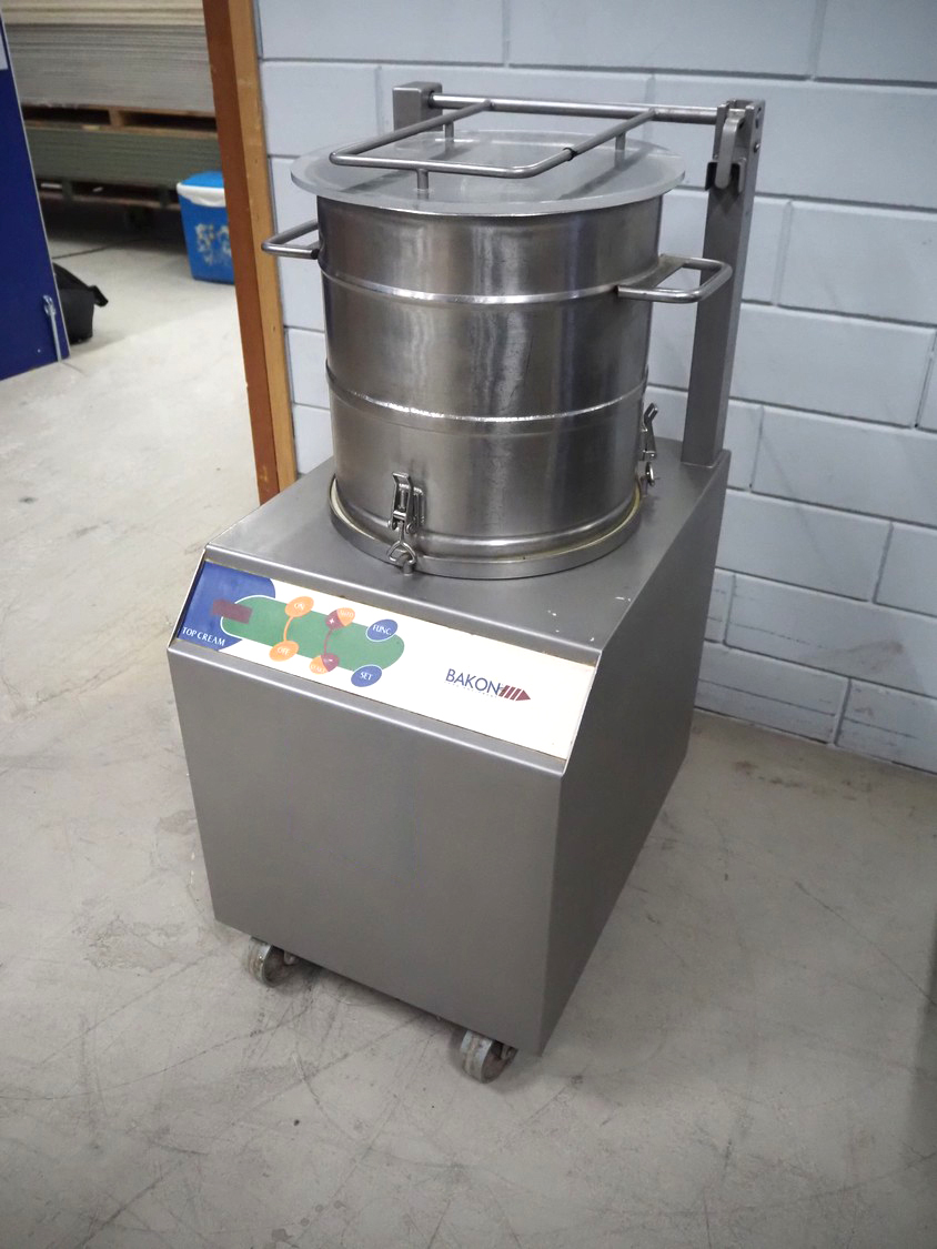 Amasadora móvil para nata Bakon tipo: TOPCREAM 1/5, número de serie: 7.015.036 año de construcción: 2001, 230 V, 50 Hz, 1050 W cuba de acero inoxidable dimensiones interiores: Ø 345 mm x 300 mm dimensiones totales: 650 mm x 465 mm x 1060 mm.