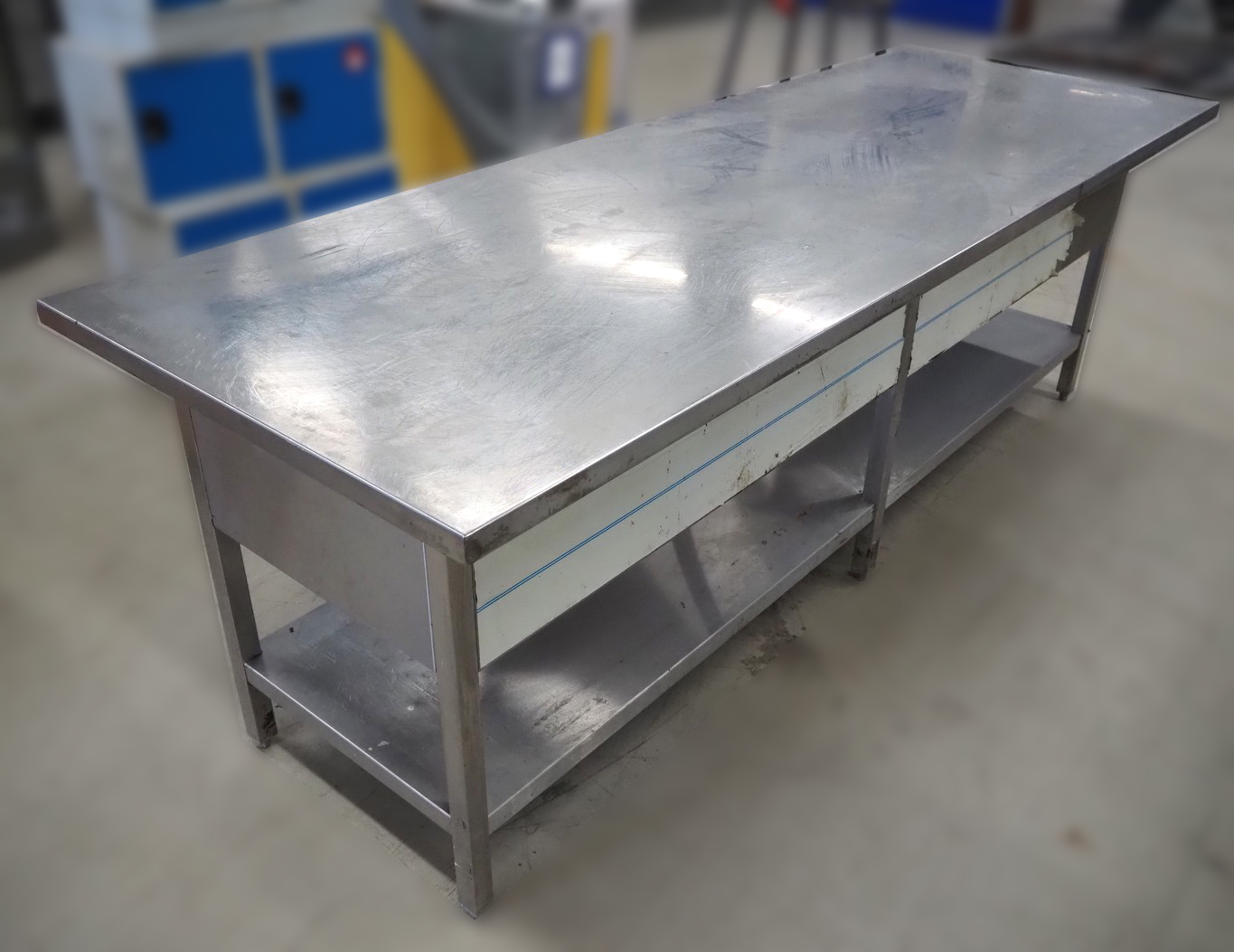 Mesa de acero inoxidable dimensiones: 2600 mm x 900 mm x 870 mm.