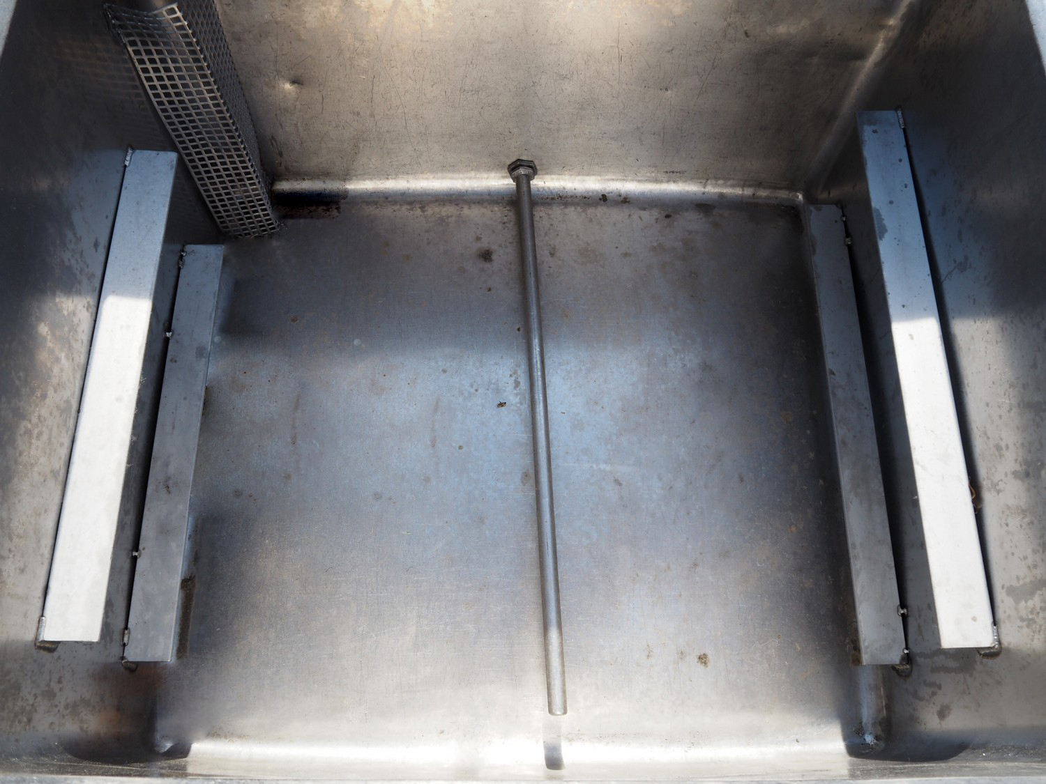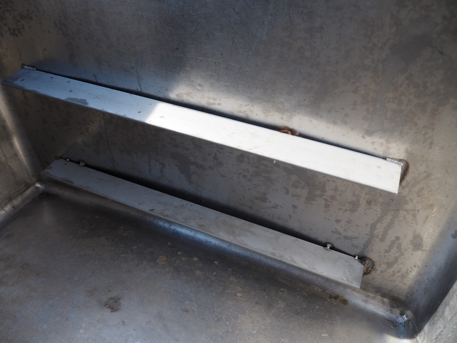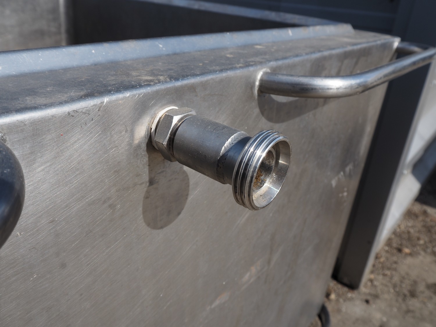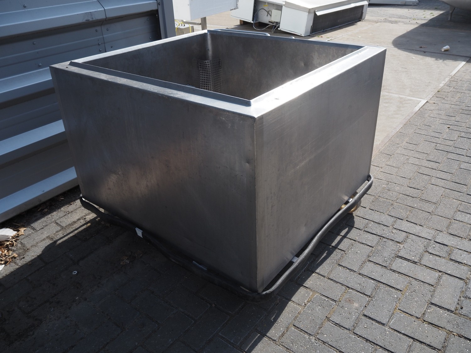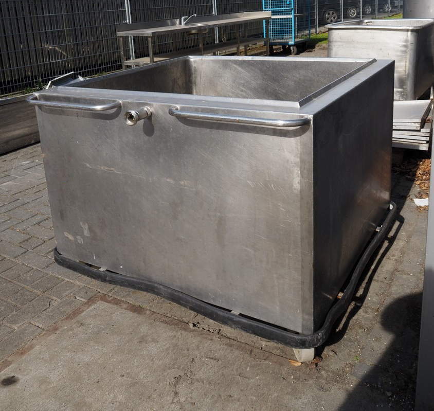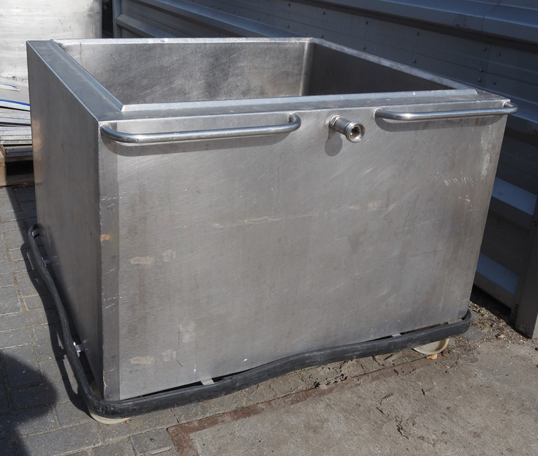 Depósito móvil de acero inoxidable dimensiones interiores: 1000 mm x 910 mm x 630 mm dimensiones totales: 1200 mm x 1100 mm x 780 mm. Capacidad: 550L. Con ruedas y protector inferior