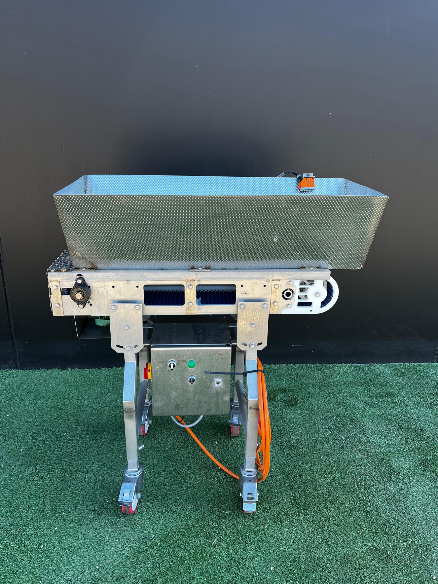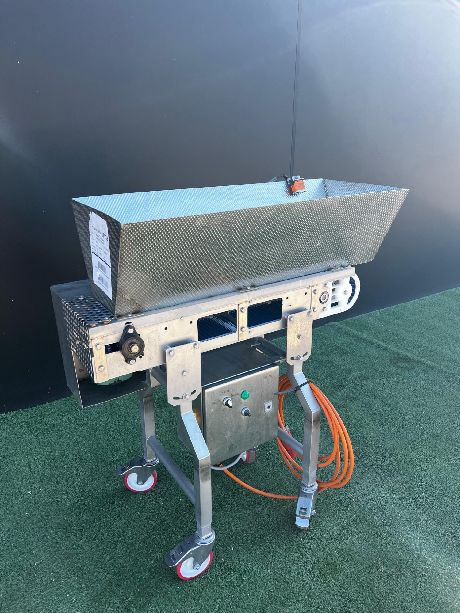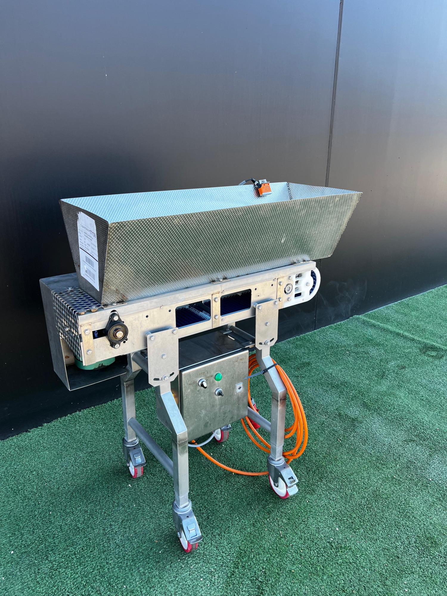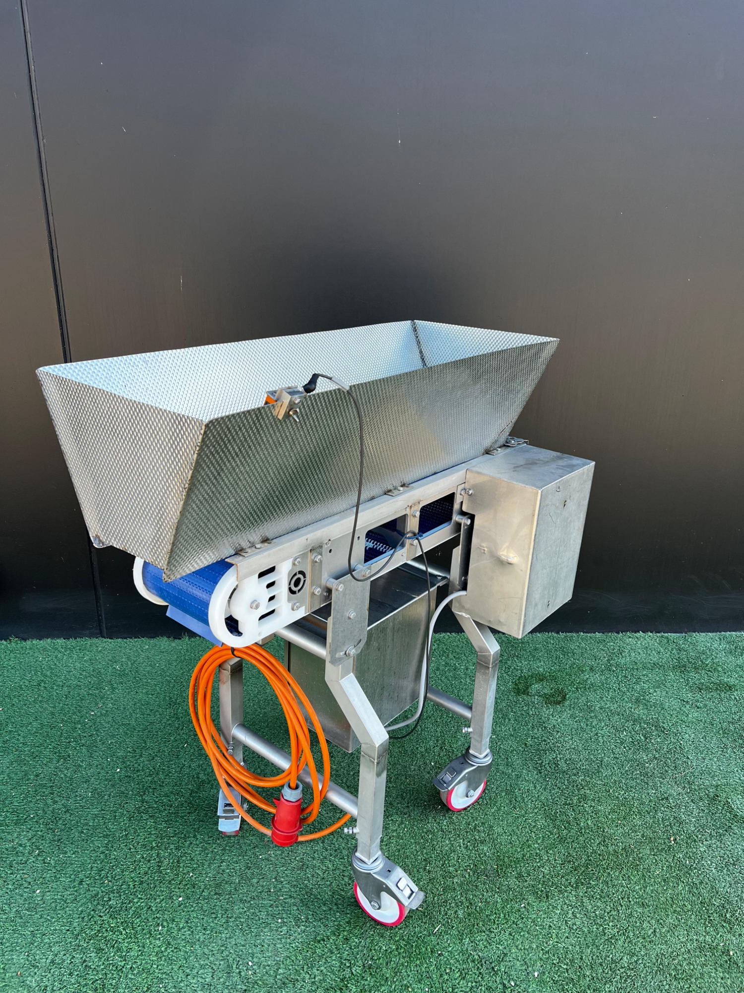 Cinta transportadora móvil, estructura de acero inoxidable, cinta de plástico con divisores, ancho de cinta: 180 mm, altura de divisor: 20 mm, distancia entre divisores: 200 mm, dimensiones totales: 1100 mm x 700 mm x 1200 mm.
