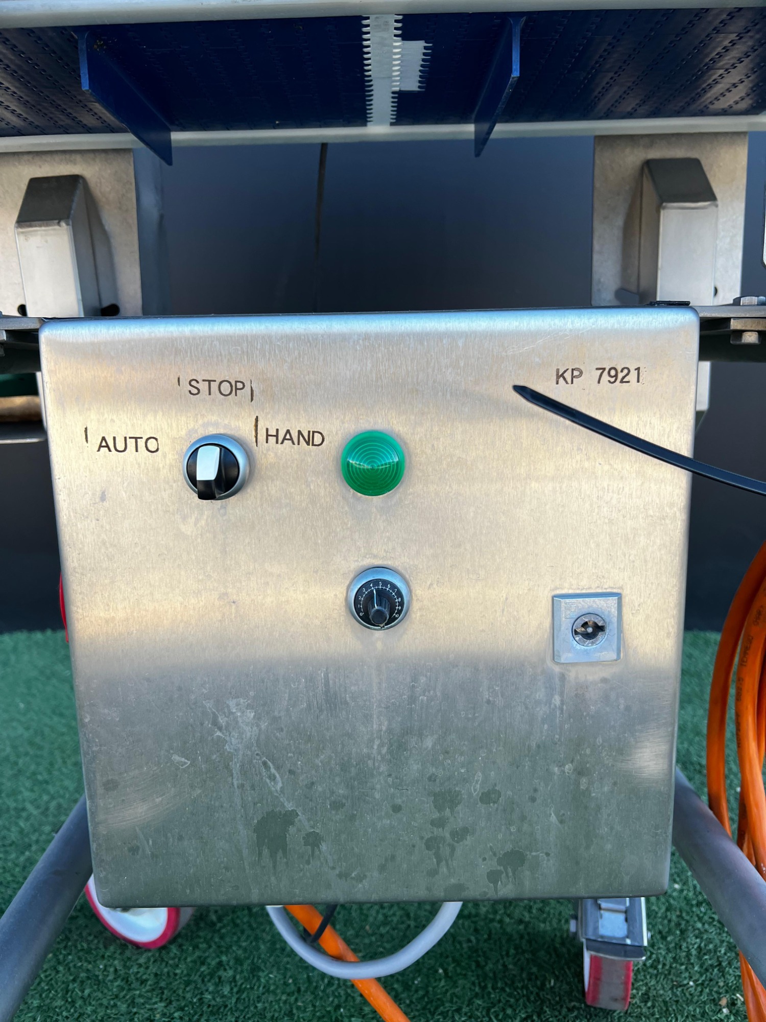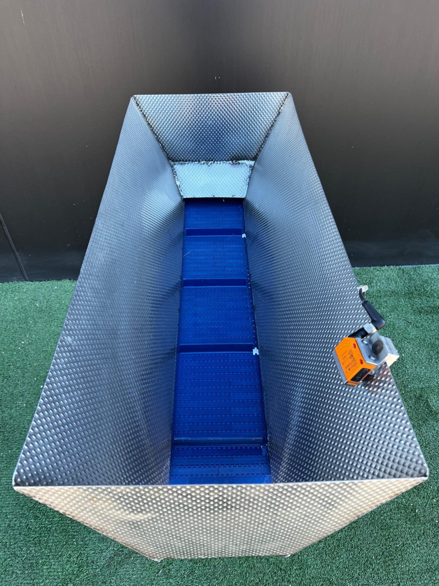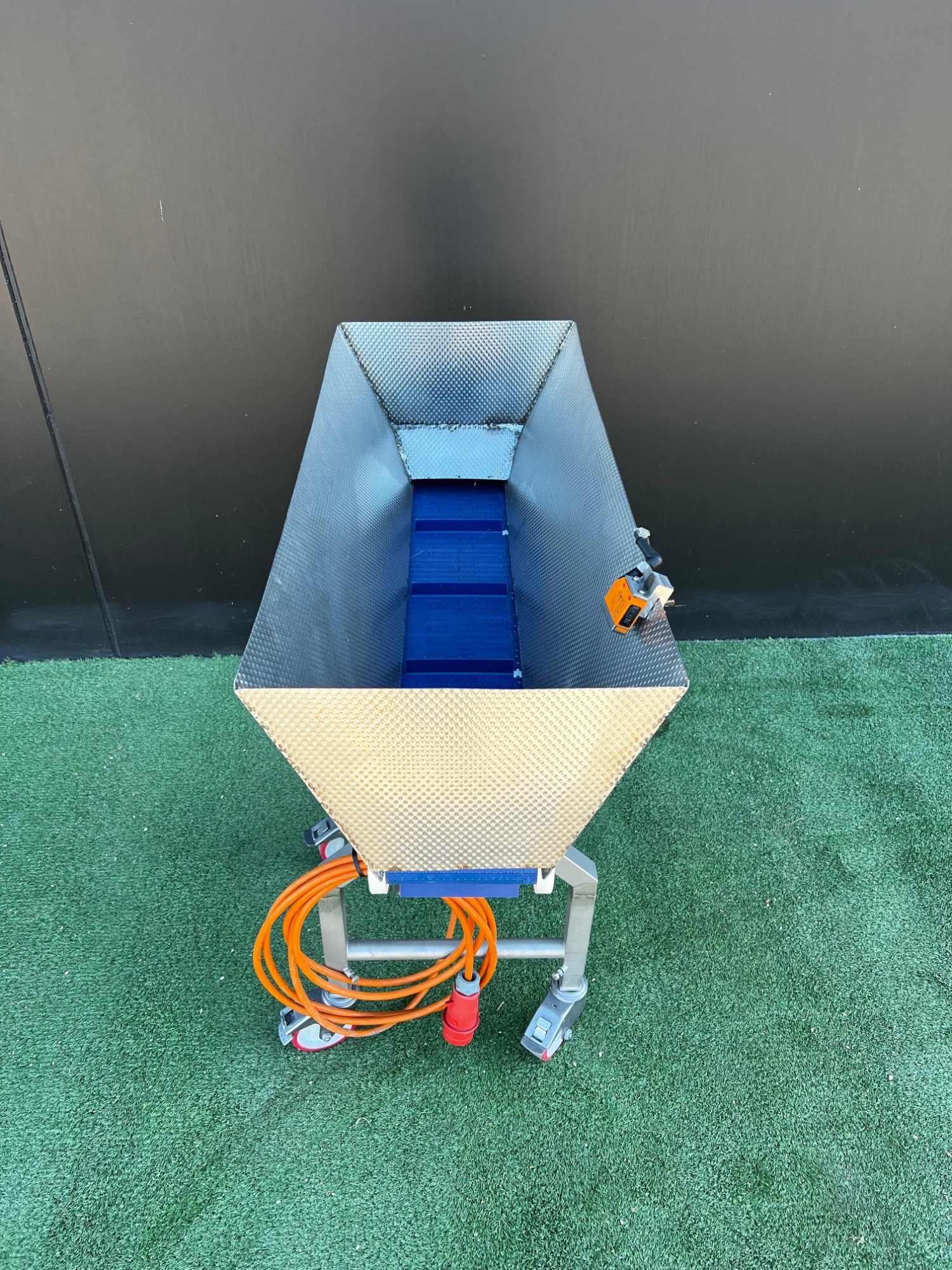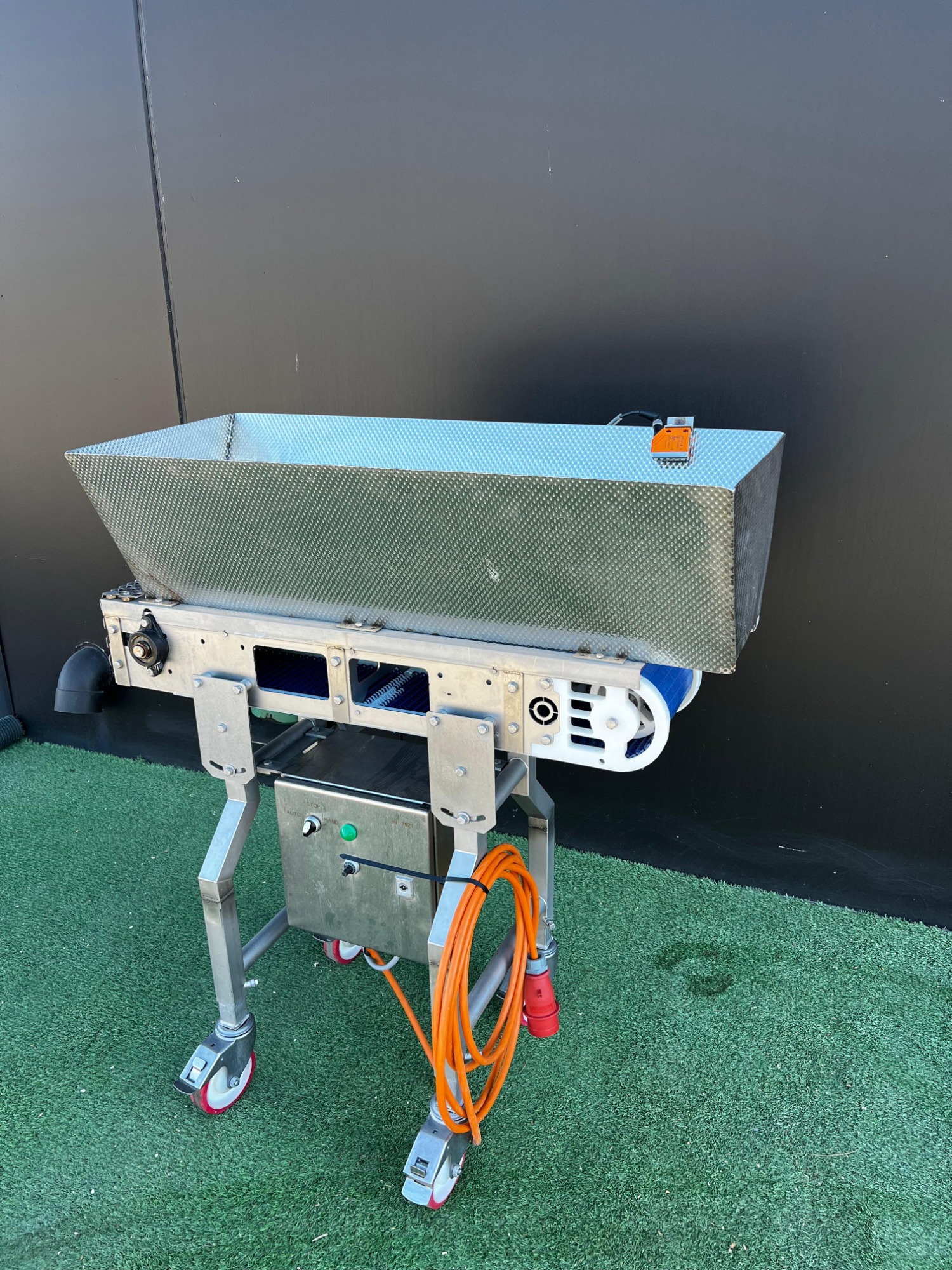 Cinta transportadora móvil, estructura de acero inoxidable, cinta de plástico con divisores, ancho de cinta: 180 mm, altura de divisor: 20 mm, distancia entre divisores: 200 mm, dimensiones totales: 1100 mm x 700 mm x 1200 mm.