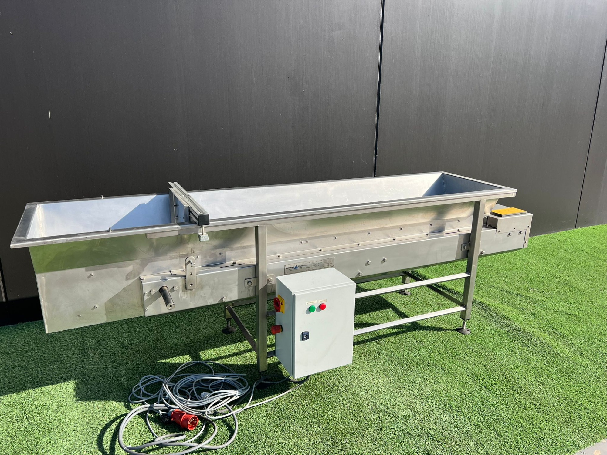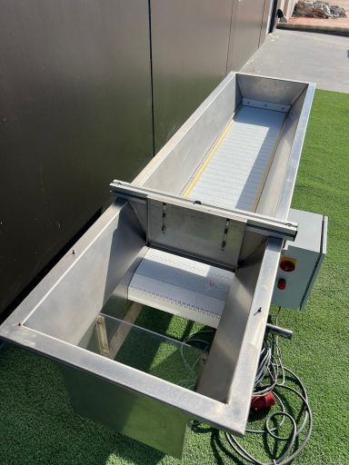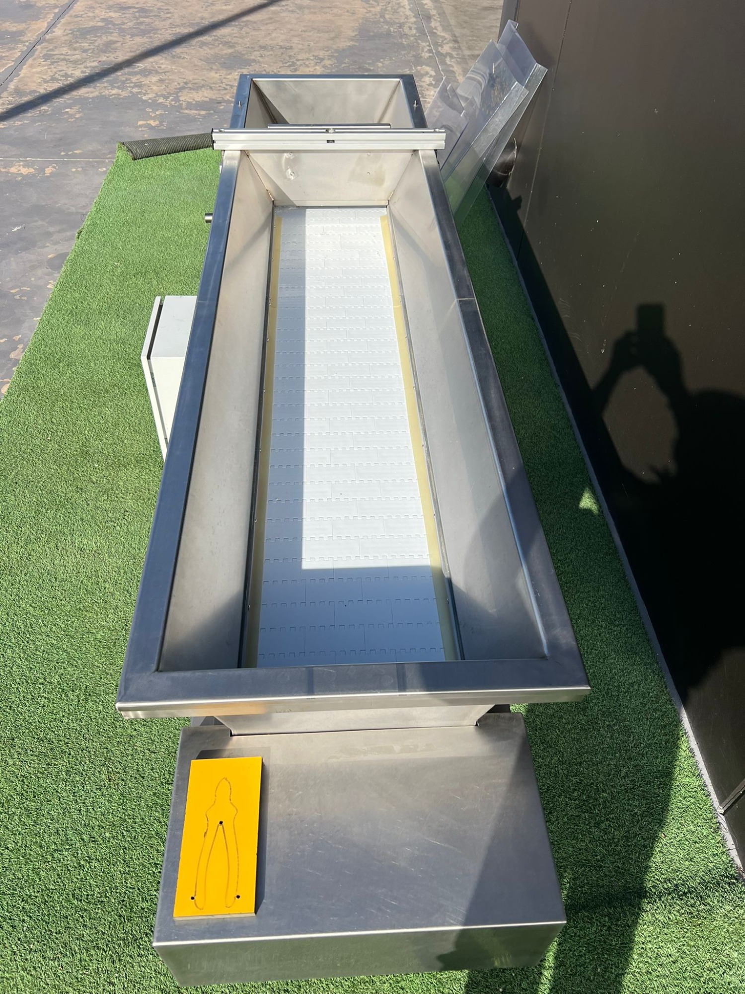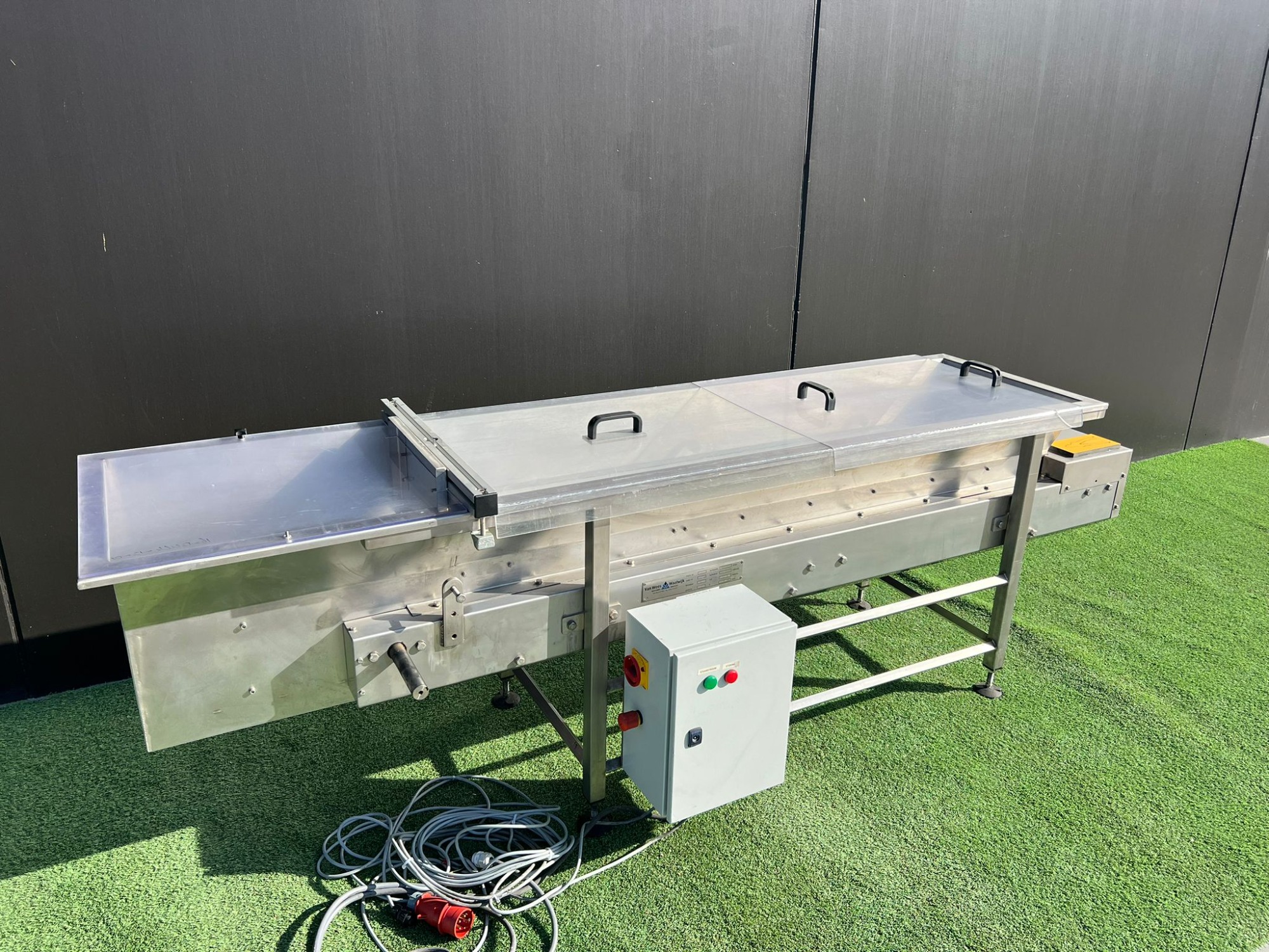 Banda transportadora Hinderink Lalobuba B-0200 de acero inoxidable, 2008 Dimensiones de la banda: L: 1900 Dimensiones totales: L: 2660 Número de serie: 43710 Marca: Hinderink Lalobuba Dimensiones de la banda: A: 350 Dimensiones totales: Ancho: 840 Peso neto: 200 Año de fabricación: 2008 Dimensiones totales: Alto: 960 Tipo: B-0200 Equipada con banda de eslabones de plástico y tapas de plexiglás