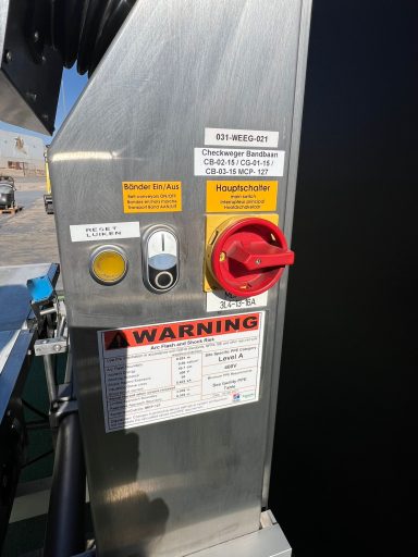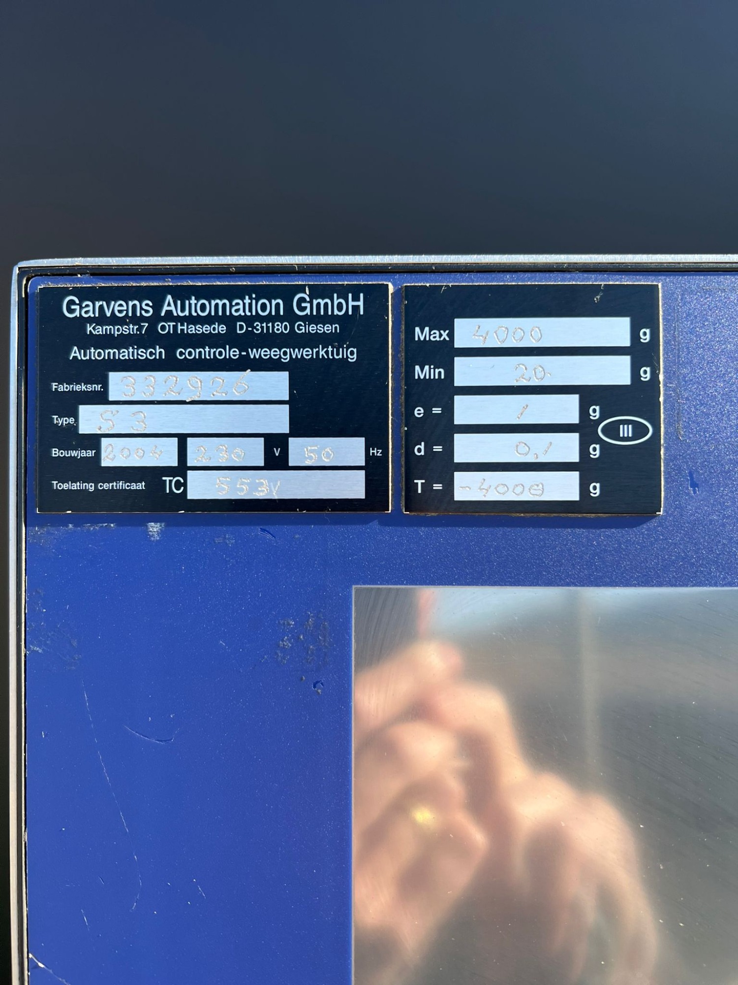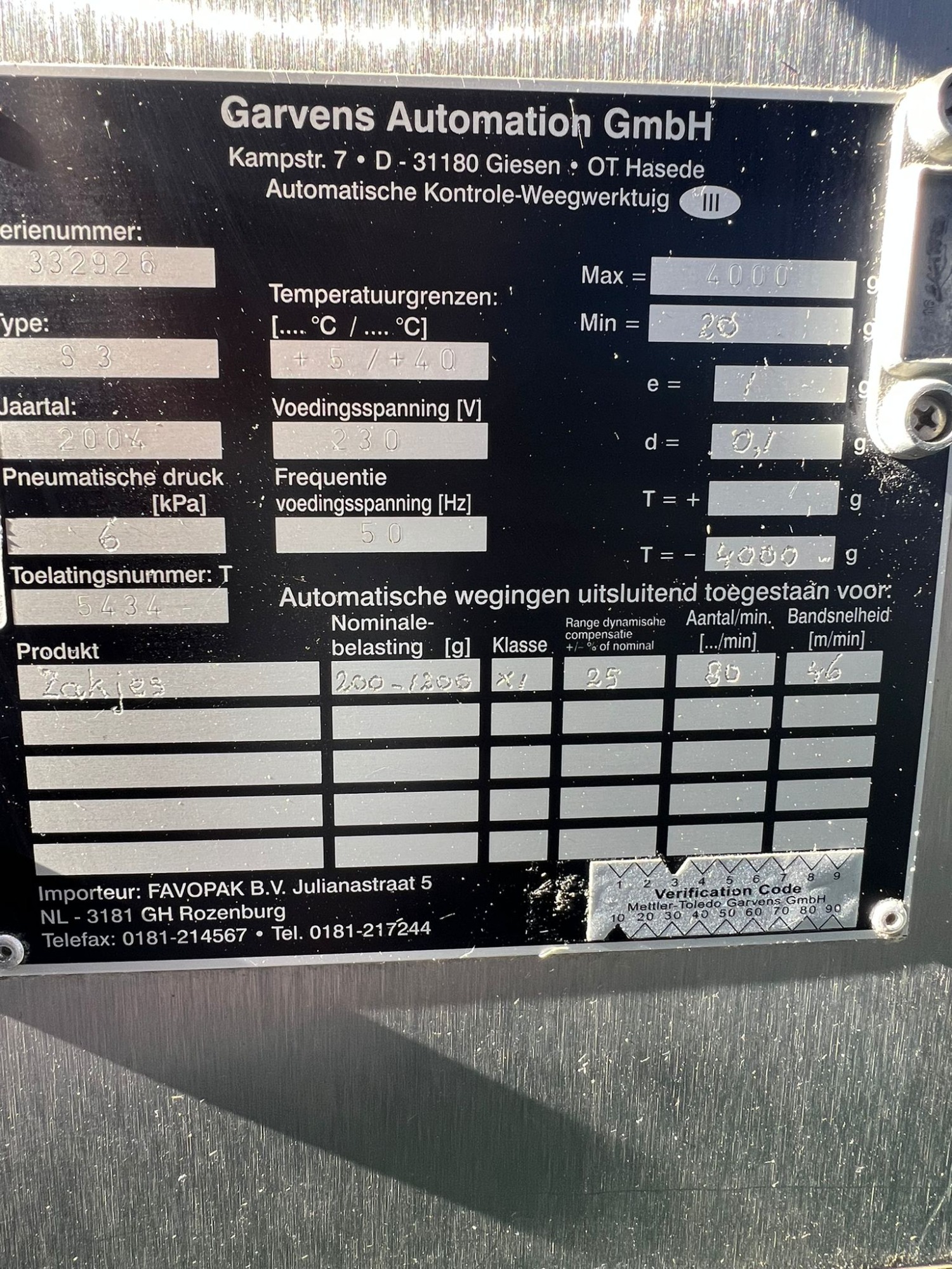 - Fabricado en acero inoxidable. - Pantalla digital tactil - Cintas de entrada, cinta de pesado y cinta para rechazos. - Type: S3 - Año: 2004 - Max: 4000 g y Min. 20 g error 1 g - 230 V temperatura de 5 a 40 grados C.
